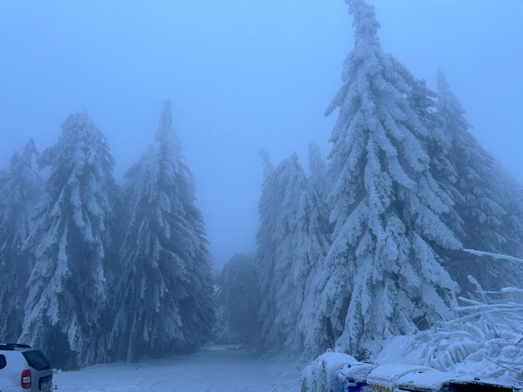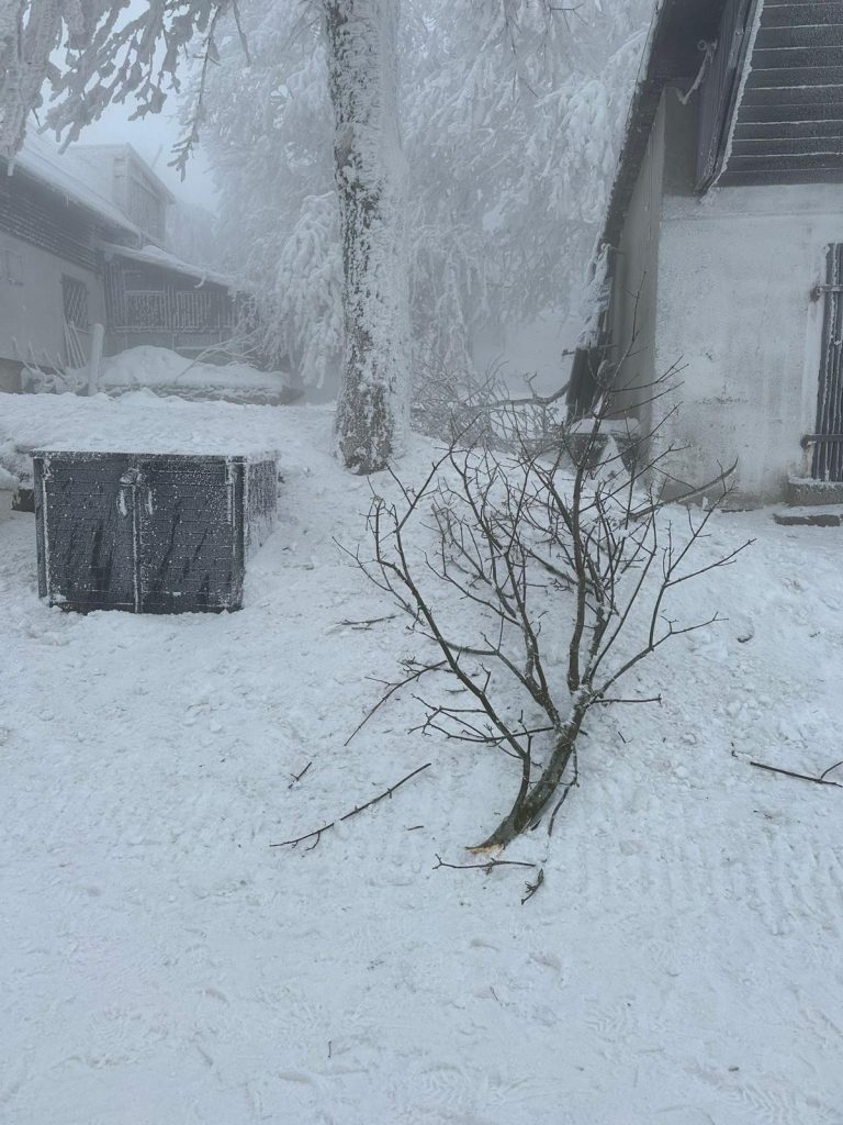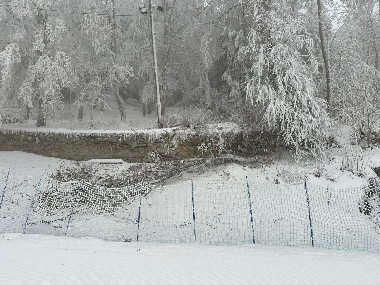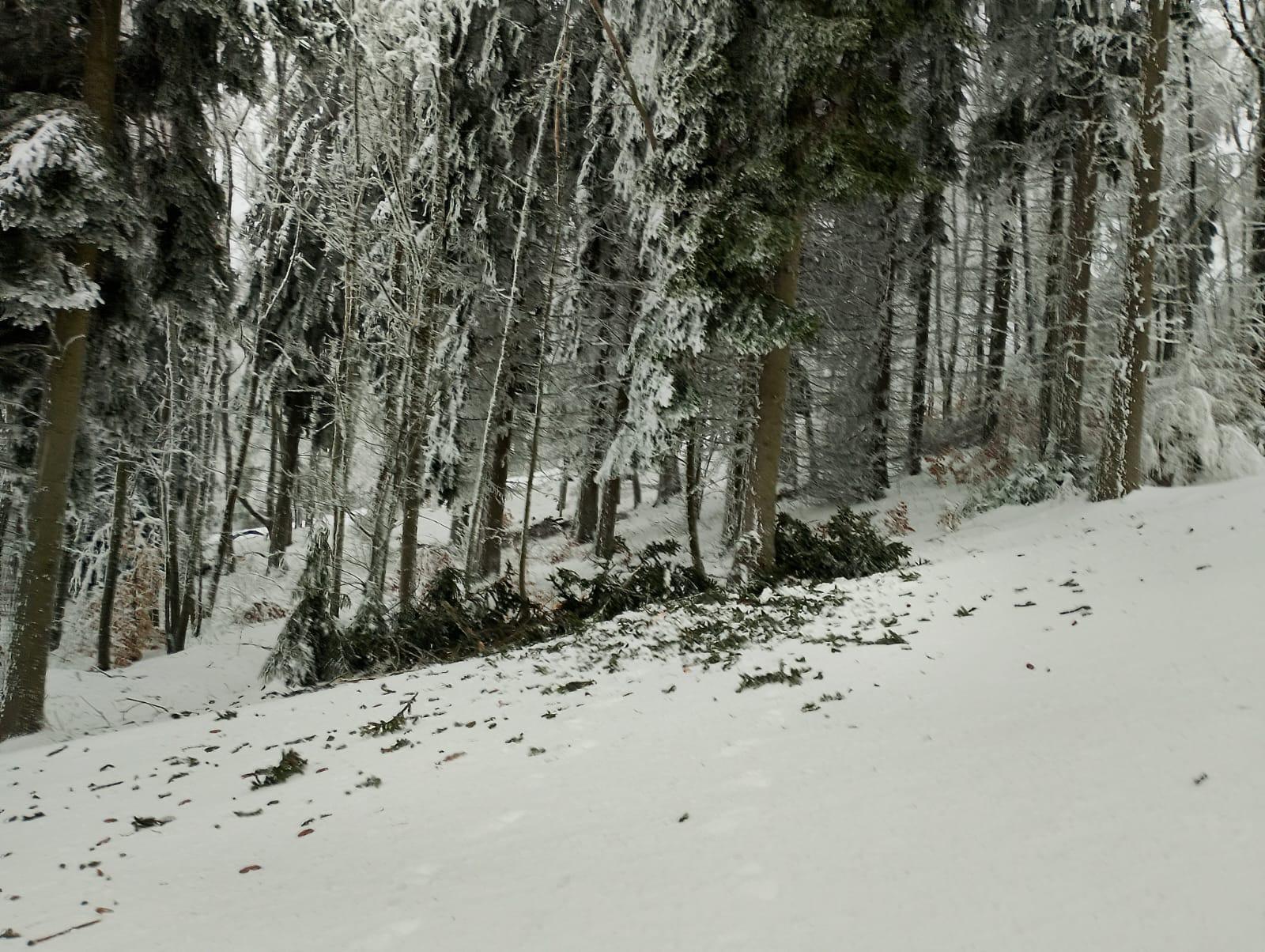 Přes noc, z úterý na středu, se očekává sněžení, což situaci nevylepší. Dnes foukal na areálu vítr v nárazech okolo 12 m/s, námraza stále drží a stromy praskají.